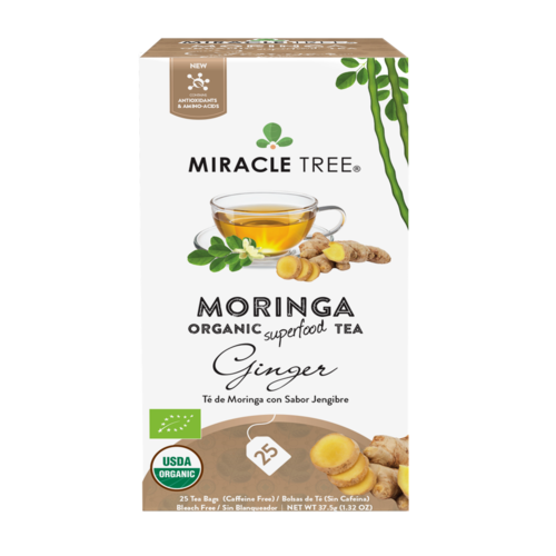 25 WRAPPED TEA BAGS, ORGANIC MORINGA LEAF, NON-GMO, CAFFEINE-FREE, & ABSOLUTELY DELICIOUS. ORGANIC MORINGA TEA, GINGER: Miracle Tree's Ginger & Organic Moringa Superfood Tea is spicy blend of Moringa dried leaves and ginger come together perfectly and results in a delicious tea making it an adventurous and enjoyable daily drink!